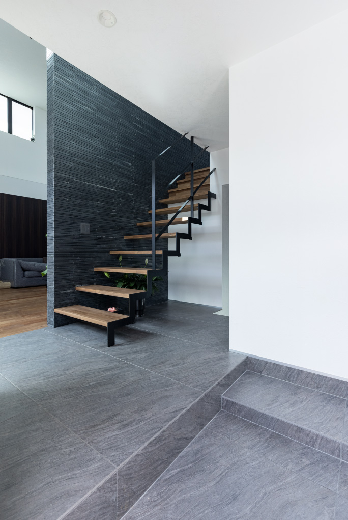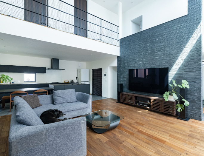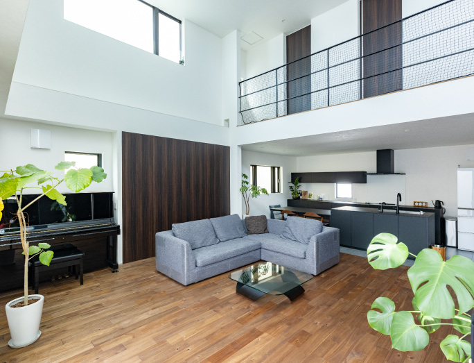 広々大空間のリビング、スキップフロア、家のどこでも気配を感じれる家、シンプルモダンテイスト